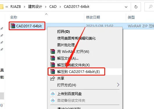 1.打开下载的软件安装包,鼠标右击压缩包【解压到CAD2017】。