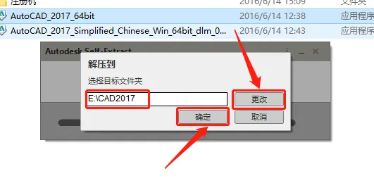5.点击【更改】选择安装程序解压路径,不建议安装在C盘,可在D盘或E盘里面新建一个CAD文件夹(文件夹名称中不要有中文),设置好解压路径后点击【确定】。