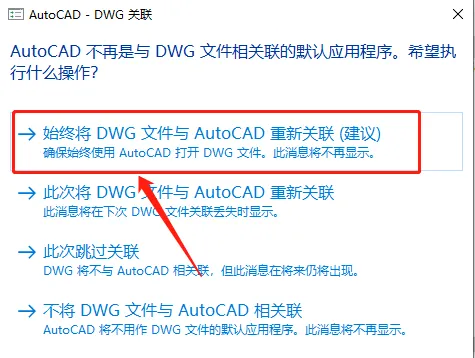 14.若出现如下图所示的界面,选择第一个【始终将DWG文件与 AutoCAD重新关联】,没有则忽略进行下一步。