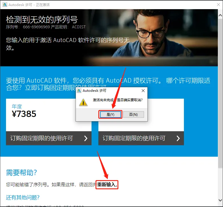 20.若出现如下图所示检测到无效的序列号,直接点击【重新输入】,然后点击【是】。若出现显示其它未激活的提示界面,直接关闭然后重新打开CAD软件后,重新输入序列号。