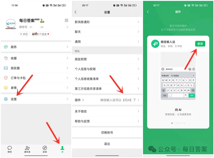 一般我们可以在手机的应用商店(软件商店)搜索“微信输入法”,然后就可以下载安装;或者打开手机微信搜索“微信输入法”,同样可以下载微信输入法。或者在手机微信的“我 - 设置 - 插件”中直接下载微信输入法。今天微来学在手机微信的“我 - 设置 - 插件”中直接下载微信输入法,并将下载和安装过程分享给大家,具体操作如下:1、打开手机微信 >> 点击右下角的“我”>> 点击“设置”>> 点击“插件”>> 点击微信输入法的【使用】按钮。