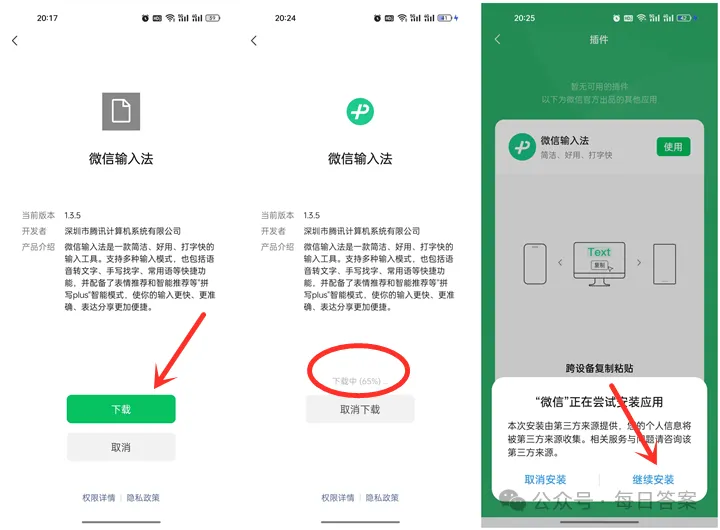 2、因为我的手机还没有安装微信输入法,所以需要下载安装,这里点击【下载】按钮,等下载完成后点击【继续安装】按钮。