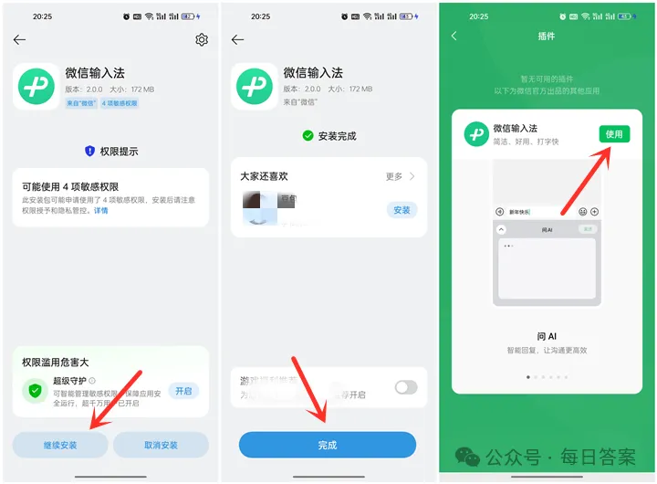 3、手机会自动检测微信输入法可能需要使用的权限,最后点击【继续安装】按钮,稍等片刻即可成功安装,最后点击【完成】按钮。回到微信插件页面点击微信输入法的【使用】按钮。