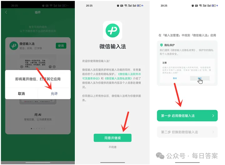 4、点击【允许】按钮,并点击【同意并继续】按钮,接着点击【第一步 启用微信输入法】按钮。