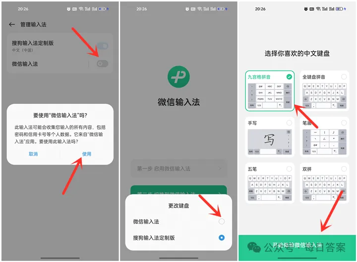 5、点击管理输入法中的“微信输入法”开关按钮,并点击【使用】按钮,接将手机默认输入法切换为“微信输入法”,然后在“更改键盘”中点击选择“微信输入法”,并选择你喜欢的键盘,最后点击【开始体验微信输入法】按钮。