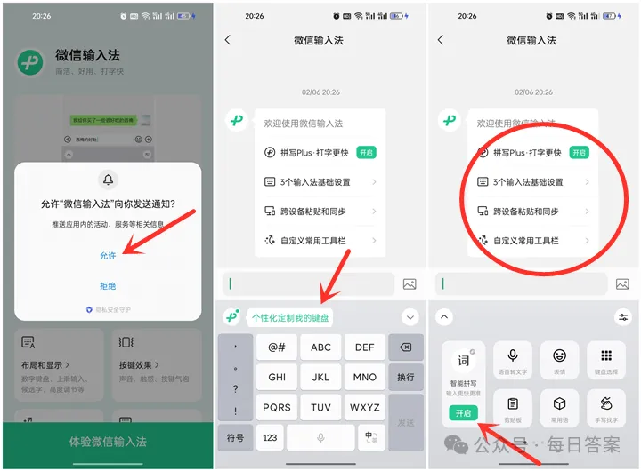 6、根据自己需求点击【允许】或【拒绝】发送通知,然后点击“个性化定制我的键盘”,可以熟悉各个设置功能。比如想要开启智能拼写就点击【开启】按钮,然后点击【立即开启】按钮即可。