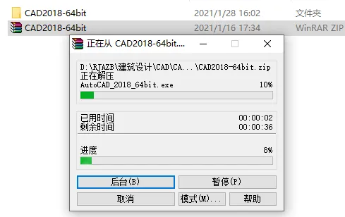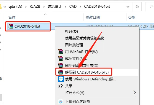 1.打开下载的软件安装包,鼠标右击压缩包【解压到CAD2018】。