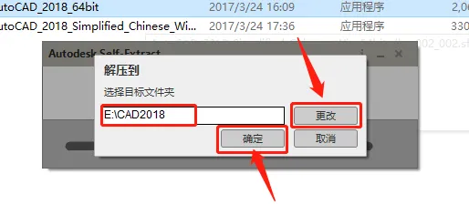 5.点击【更改】选择安装程序解压路径,可在D盘或E盘里面新建一个CAD文件夹(文件夹名称中不要有中文),设置好解压路径后点击【确定】。