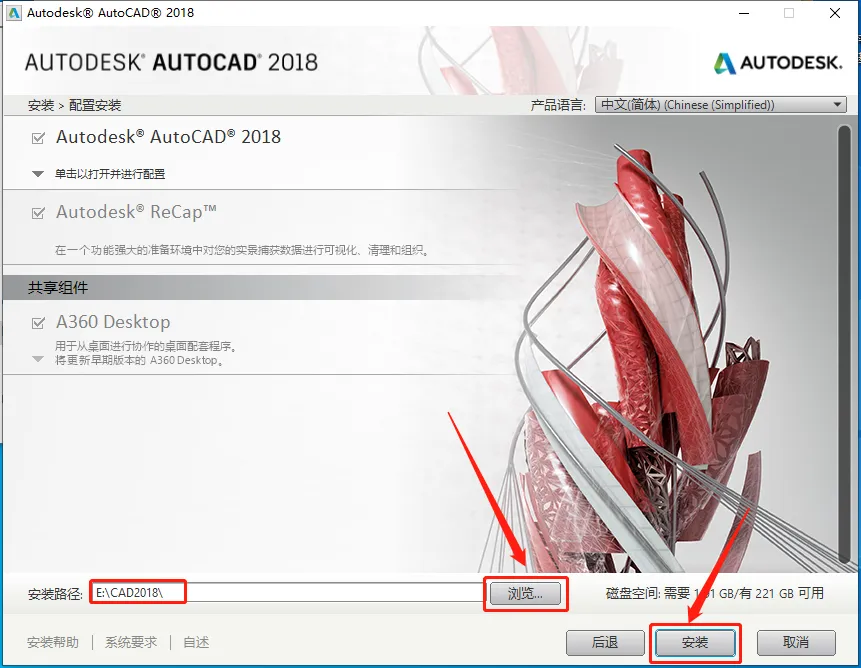 9.点击【浏览...】设置CAD软件安装路径:建议安装到除C盘以外的磁盘,可以直接选择之前新建的那个解压文件夹,(文件夹名称中不要有中文)设置好安装路径后点击【安装】。