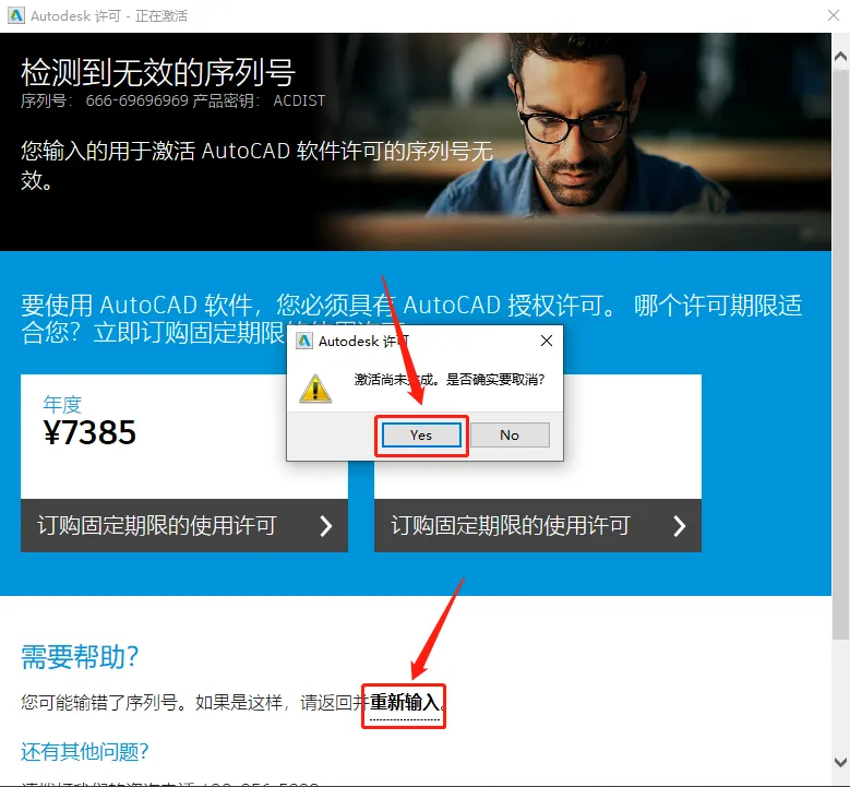 21.若出现如下图所示检测到无效的序列号,直接点击【重新输入】,然后点击【是】。若出现显示其它未激活的提示界面,直接关闭然后重新打开CAD软件后,重新输入序列号。