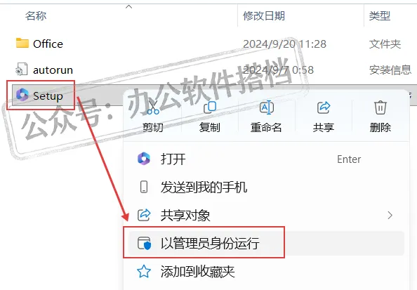 3.选择【Setup】程序,右键点击【以管理员身份运行】打开Visio 2024软件的安装界面。