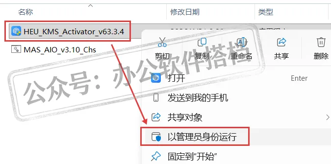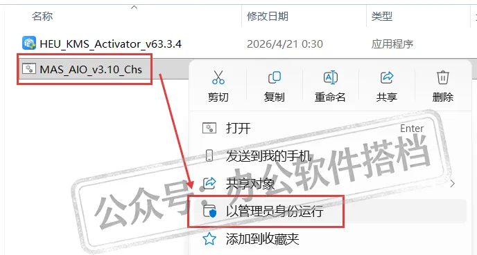 第一种:选中【MAS_AIO_v3...】工具,右键选择【以管理员身份运行】。
