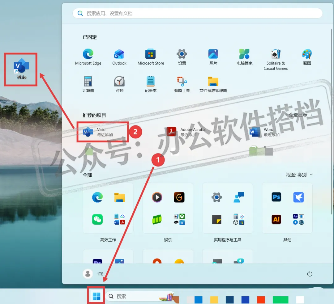 8.创建Visio 2024软件桌面图标:点击桌面【开始图标】展开,找到刚安装的Visio 2024程序,直接拖到桌面就可以创建完成。