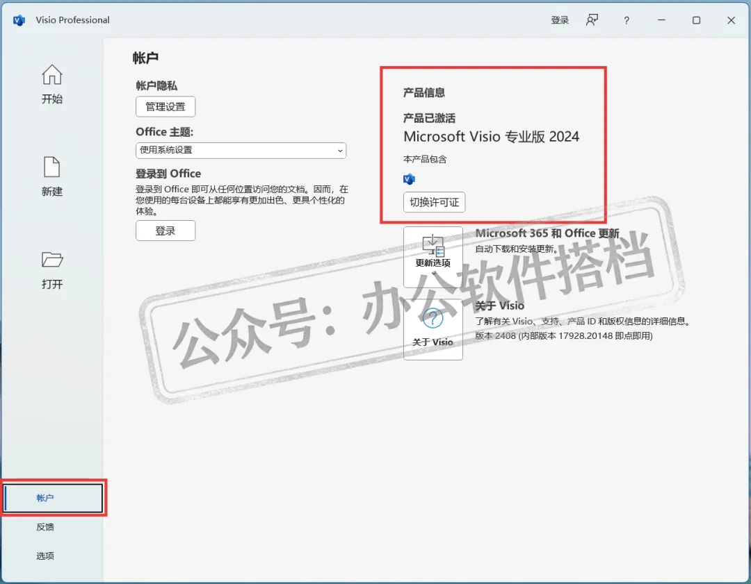 14.点击Visio 2024软件主界面左下方的【账户】即可查看状态!
