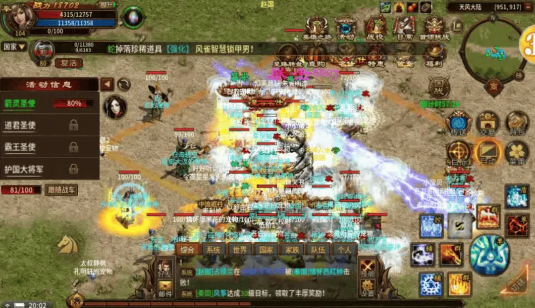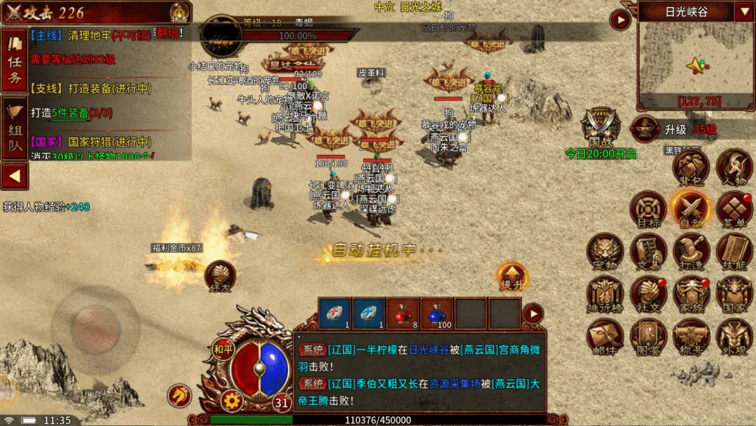 等级无需刻意硬刷,重心转向打宝攒资源。专注挑战世界BOSS、远古遗迹、王陵秘境,获取橙装、暗金装备和高阶材料。利用离线挂机补充经验,同时积攒国战功勋,兑换装备碎片和专属称号,备战每周国战。