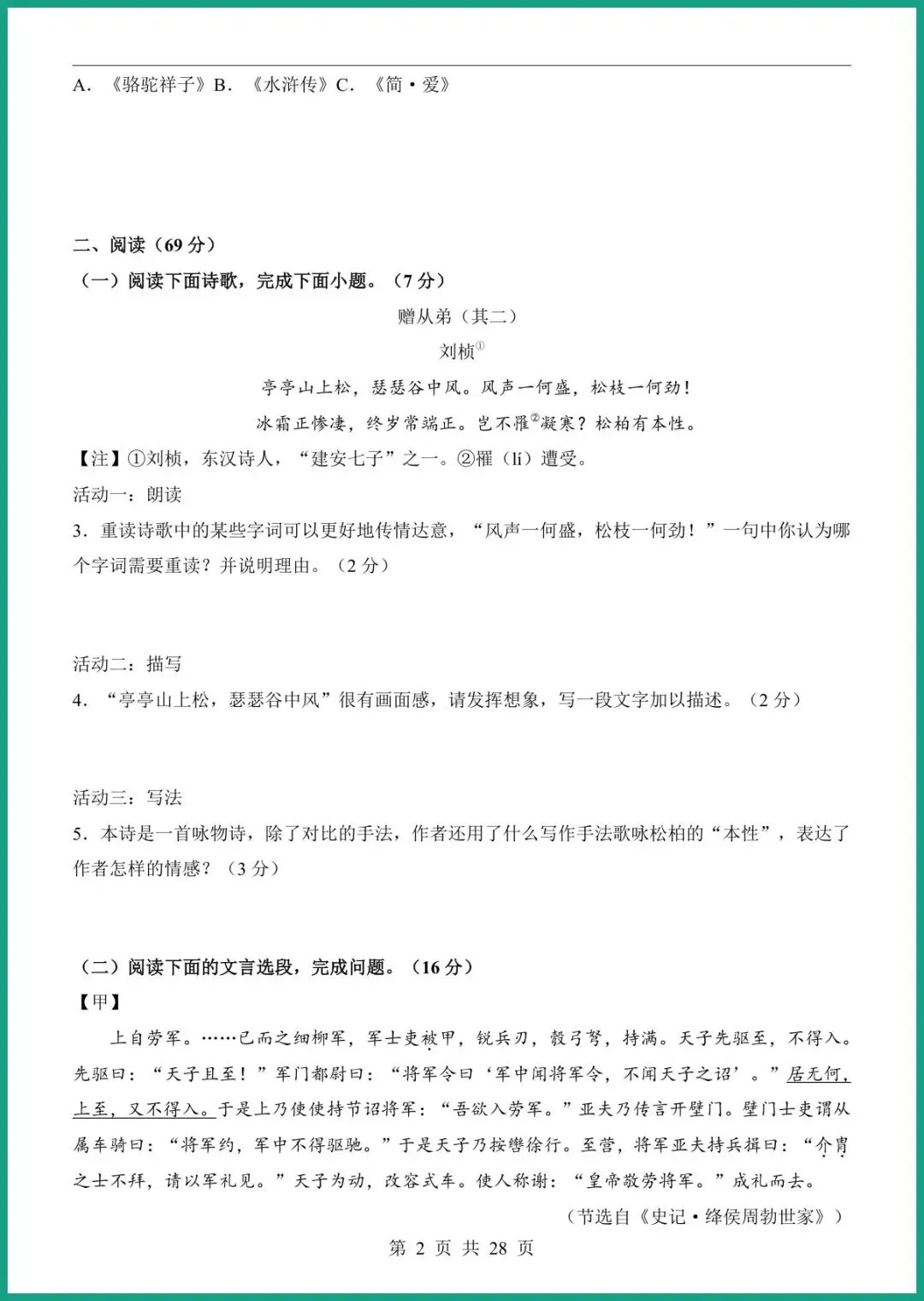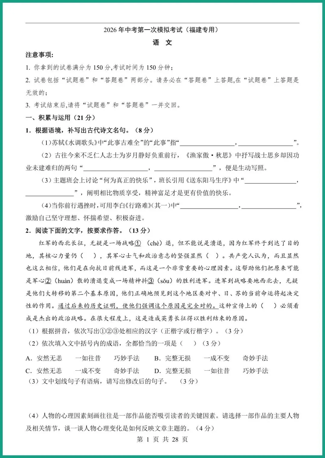 2026福建中考语文第一次模拟卷新鲜出炉,28页全彩电子版,专为九年级娃量身定制!涵盖基础闯关、古诗文阅读、现代文阅读、写作升格四大板块,附标准答案与评分细则,一针见血点出易错题型,帮孩子提前熟悉省命题风格,精准查漏补缺,作文更配高分范文审题技巧,临考不慌。想让孩子把第一次模考当成正式中考练兵?现在就打印,限时练起来!