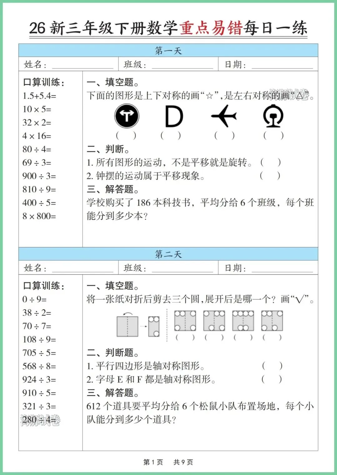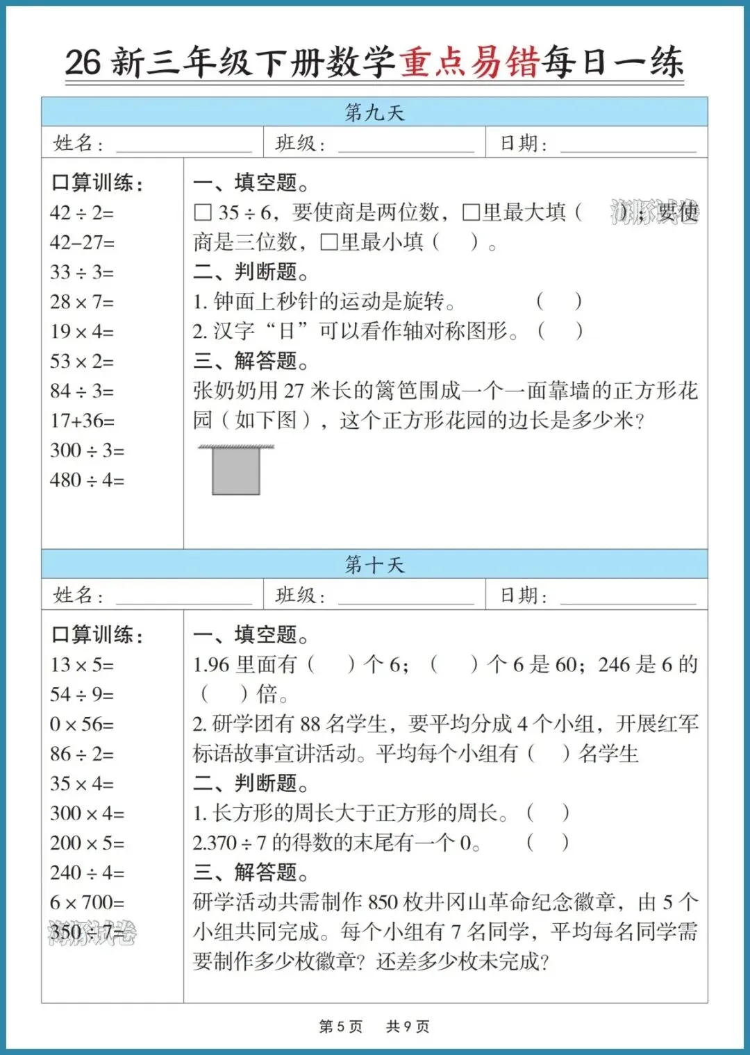 26年春人教版三年级下册数学重点易错每日一练,共9页电子版,打印即用!精选孩子最易踩坑的“面积单位换算、除法进退位、分数比大小”等高频错题,一天一页,扫码即看答案讲解,十分钟帮孩子把漏洞变成得分点。坚持两周,计算不跳步、应用题不漏单位,期末卷面干净又高分!家有三年级娃的家长,赶紧打印贴墙,每天练一页,轻松提分不熬夜!