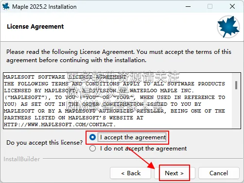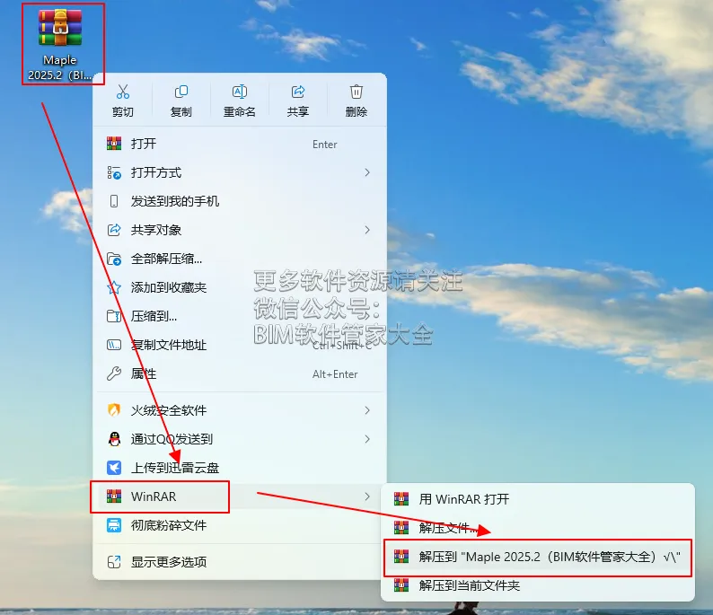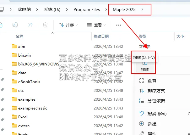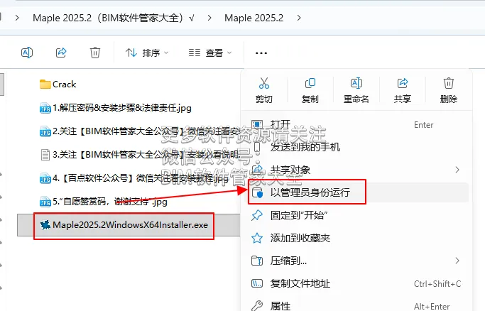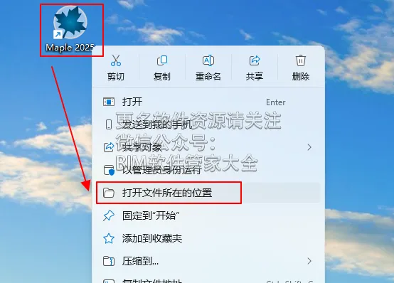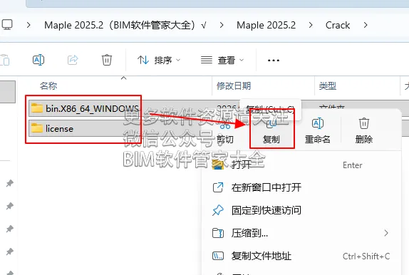 [特别提醒]:解压和安装前先退出360、电脑管家等所有杀毒软件,且WIN10需要关闭“设置-更新与安全-Windows安全中心-病毒和威胁防护-管理设置-实时保护-关”,防止误杀破解工具,导致激活失败。1、鼠标右键选择下载好的安装包【Maple 2025】,然后选择【解压到“Maple 2025”】进行解压。(下载软件安装包之前务必将杀毒软件以及防火墙关闭,避免将破解补丁或注册机删除)温馨提示:win11系统需先点击“显示更多选项”,找到解压软件进行解压。2、鼠标左键双击打开解压好的【Maple 2025】文件夹。3、打开刚刚解压的文件夹,鼠标右键点击“Maple2025.0WindowsX64Installer.exe”选择“以管理员身份运行”。7、勾选“I accept...”.点击“Next”。8、选择安装位置,小编建议安装到除C盘外的其他盘(根据个人习惯选择),小编直接将“C”改为“D“,这样确定安装位置之后,设置好后,直接点击【Next】(也可以选择如图所示的“文件夹”图标来更改软件安装位置)。15、取消勾选“Activate Maple ...”,点击“Finish”。16、返回之前解压的“Maple 2025.2”文件夹,双击打开“Crack”文件夹,选中该文件夹下的全部文件,鼠标右键点击“复制”。17、在桌面上找到软件图标,鼠标右键点击“打开文件所在位置”。18、在打开的路径栏中点击“Maple 2025”。19、在打开的文件夹空白处,鼠标右键“粘贴”刚才复制的文件。