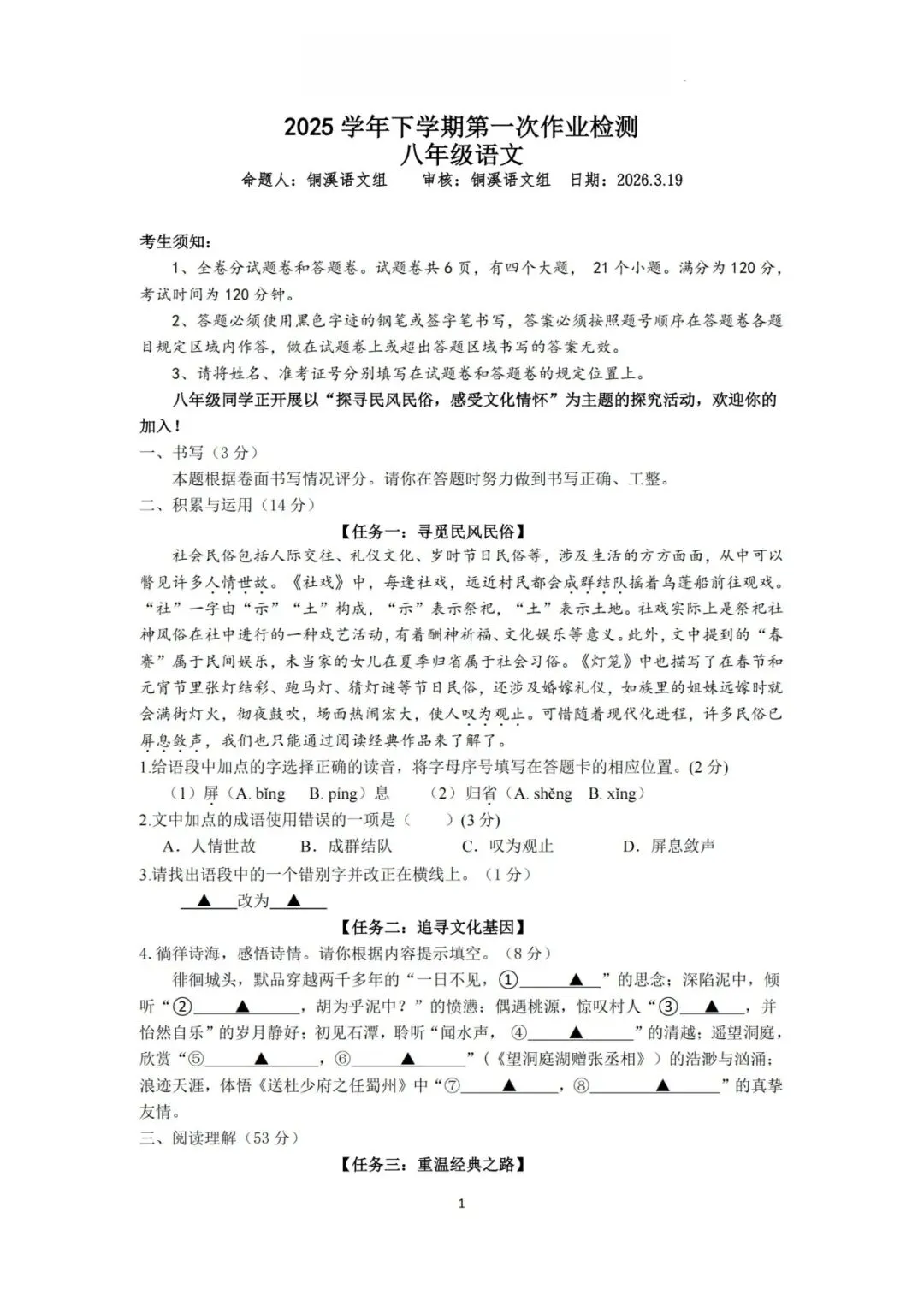 >(免费下载)义乌铜溪春晗赤岸义亭镇中等校八下试卷(全科含答案听力答题卷)