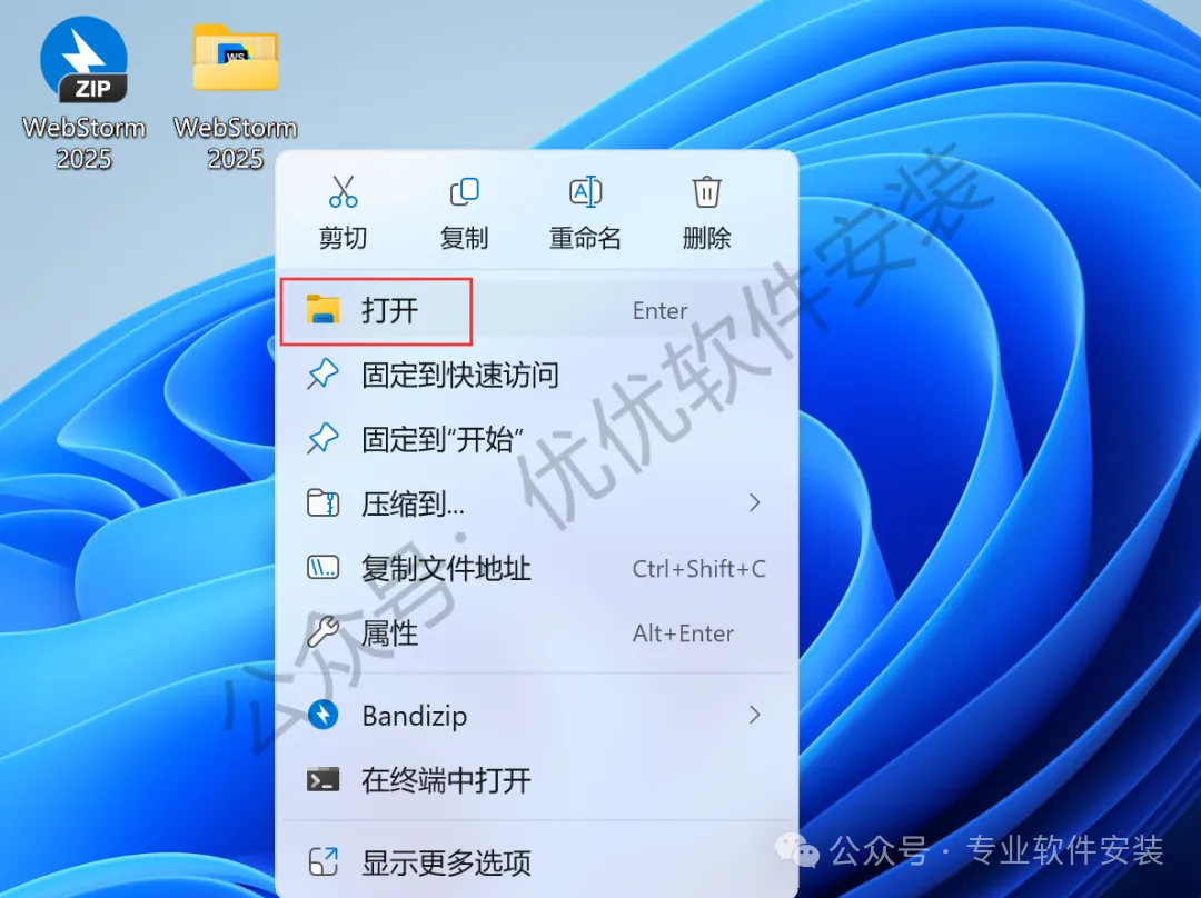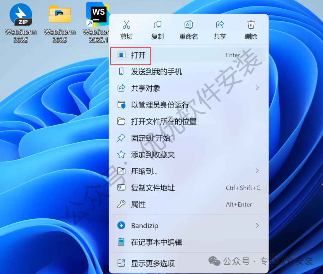 10、回到桌面,右键桌面上的【WebStorm 2025软件图标】,点击【打开】