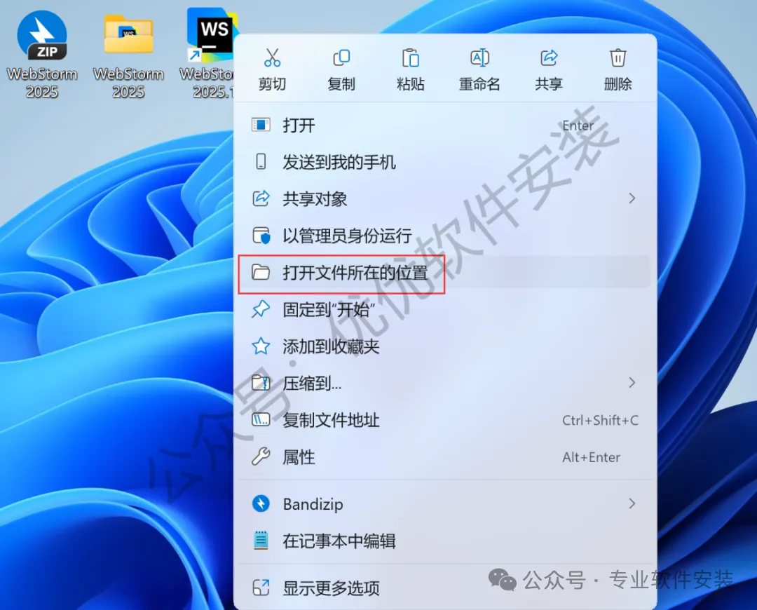 17、回到桌面,右键桌面上的【WebStorm 2025.1软件图标】,点击【打开文件所在的位置】