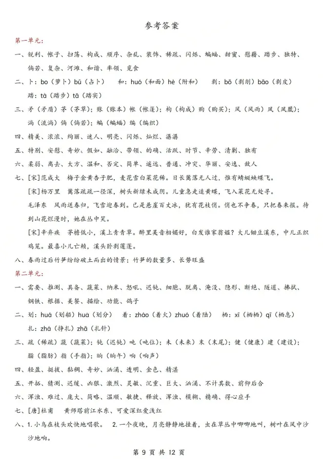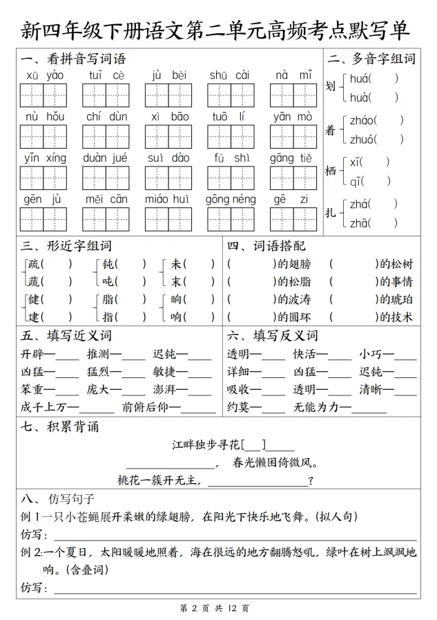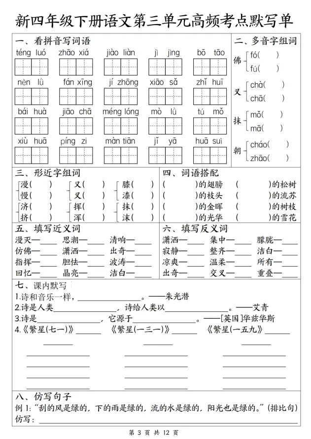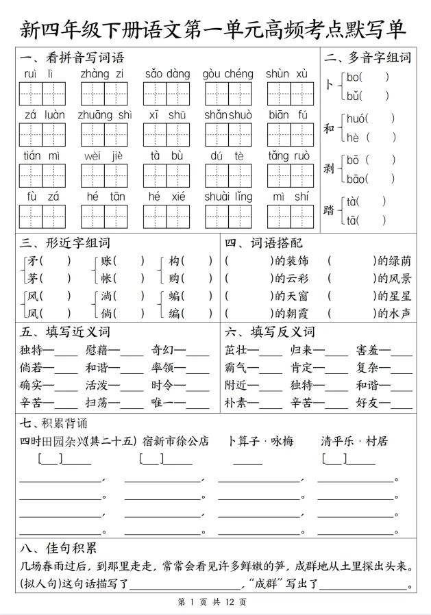 【免费下载】4年级(下)语文1-4单元高频考点默写单,PDF电子版,高清电子版可打印.