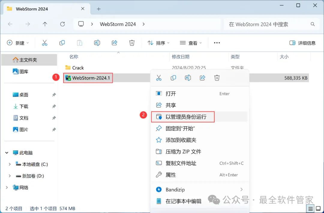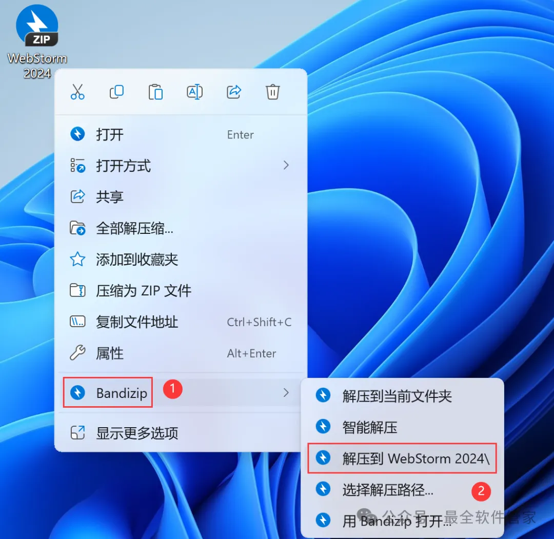 1、下载WebStorm 2024软件安装包到电脑上,右键选择【解压到WebStorm 2024\】