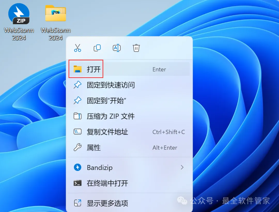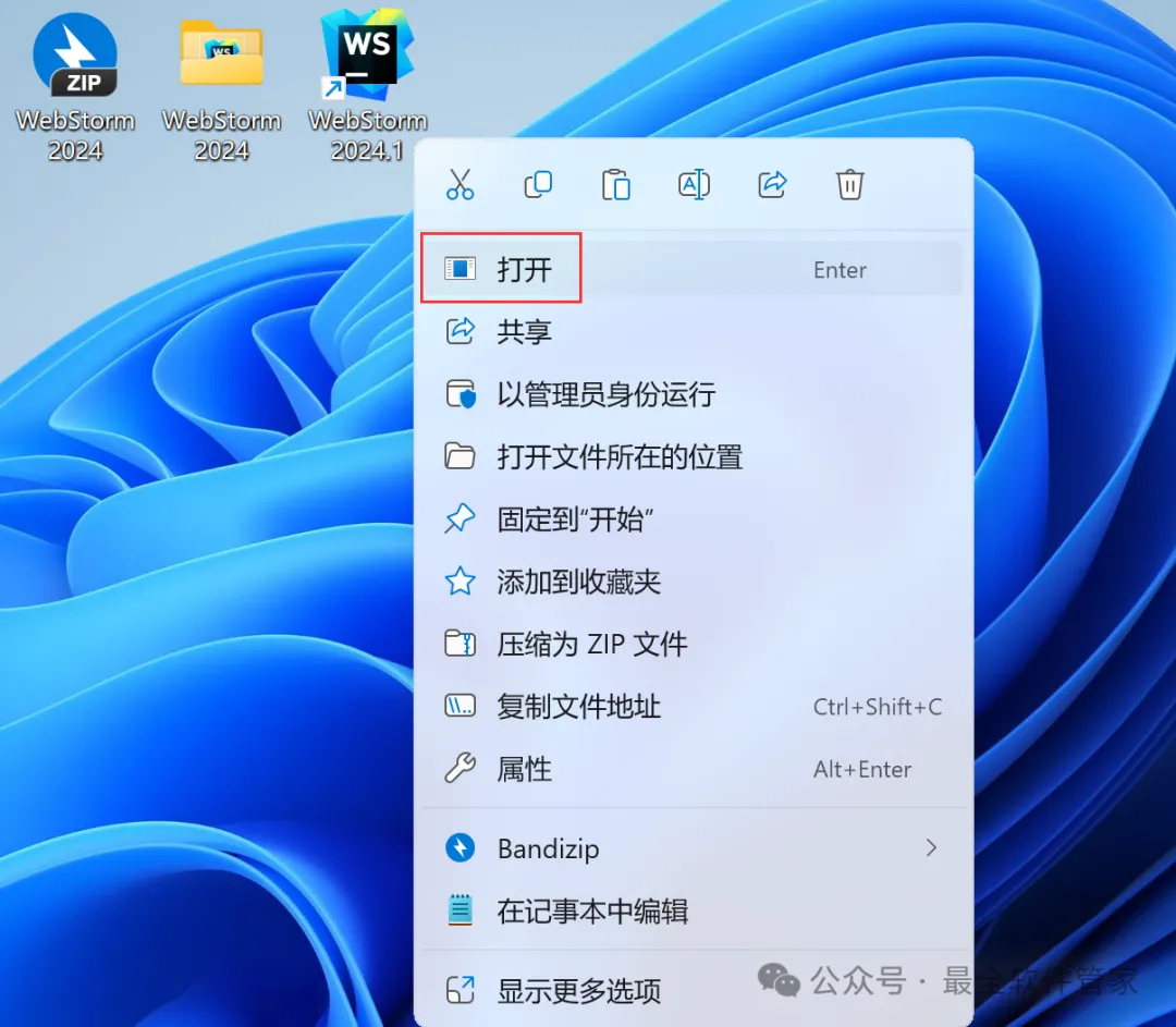 18、回到桌面,右键桌面上的【WebStorm 2024软件图标】,点击【打开】