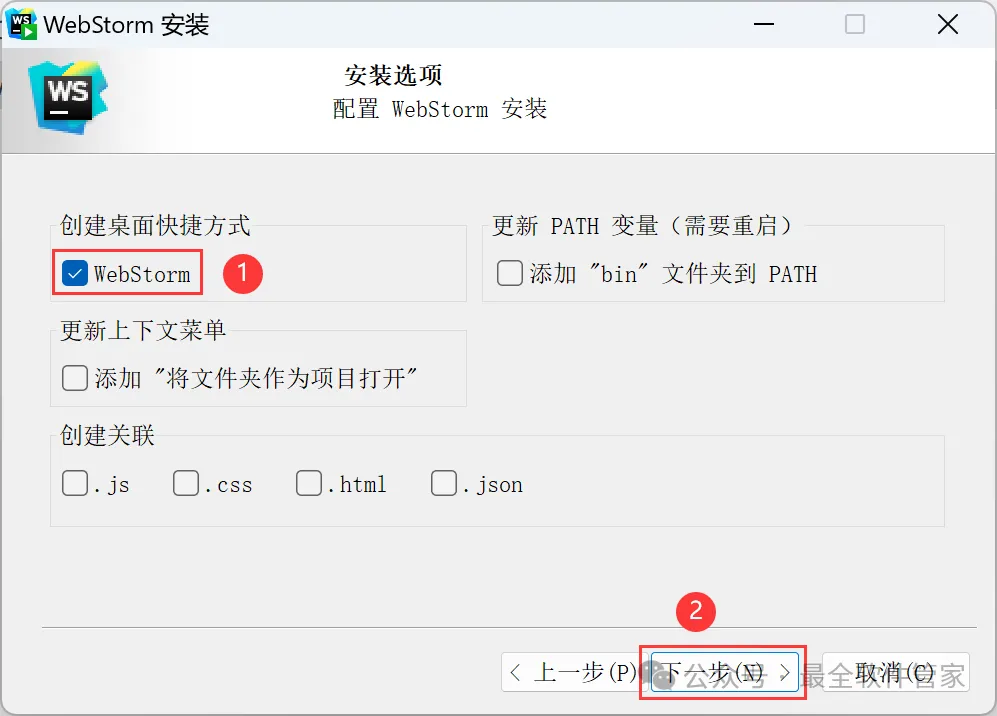 6、勾选【创建WebStorm桌面快捷方式】,再点击【下一步】