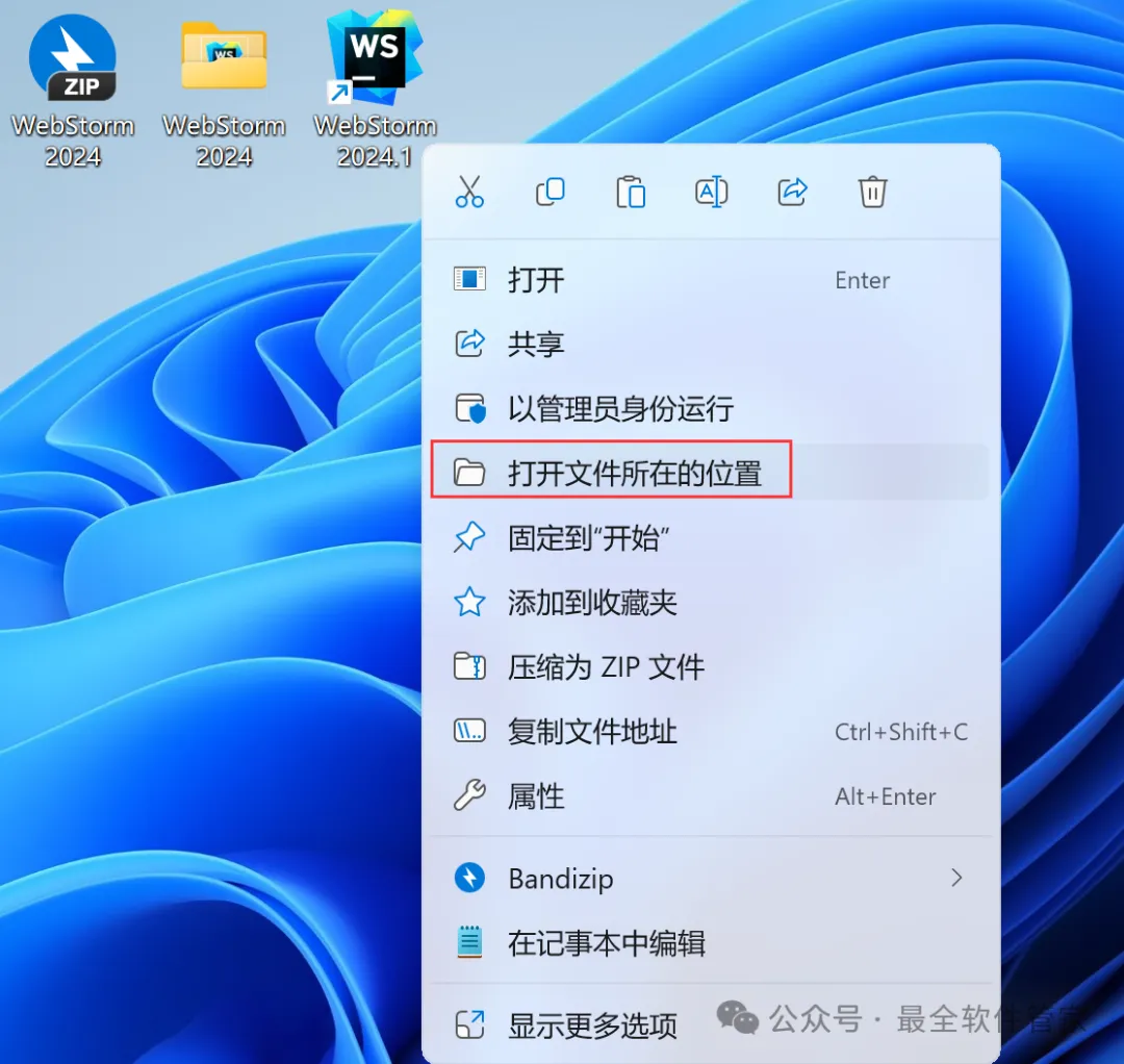 11、回到桌面,右键桌面上的【WebStorm 2024.1软件图标】,点击【打开文件所在的位置】