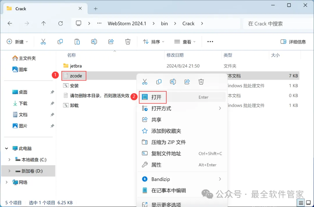 21、回到Crack文件夹,找到【zcode】文档,右键【打开】它
