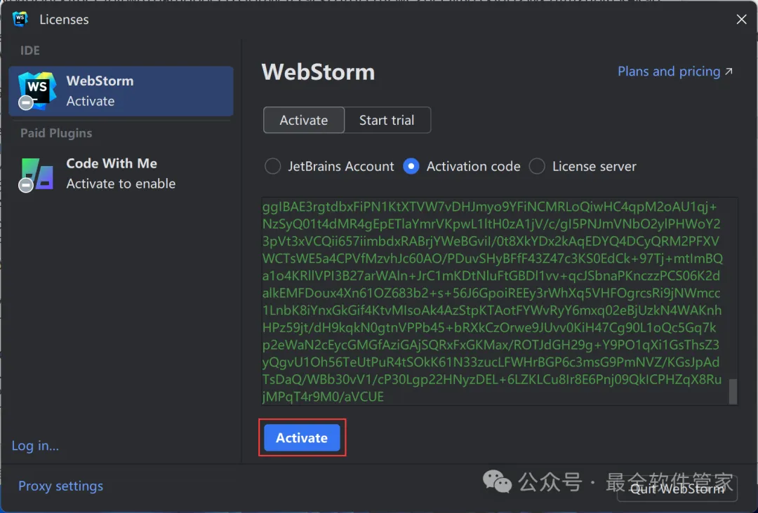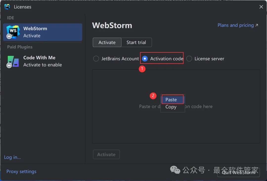 23、回到WebStorm 2024软件界面,点击【Activation code】,再右键的空白处,点击【Paste】