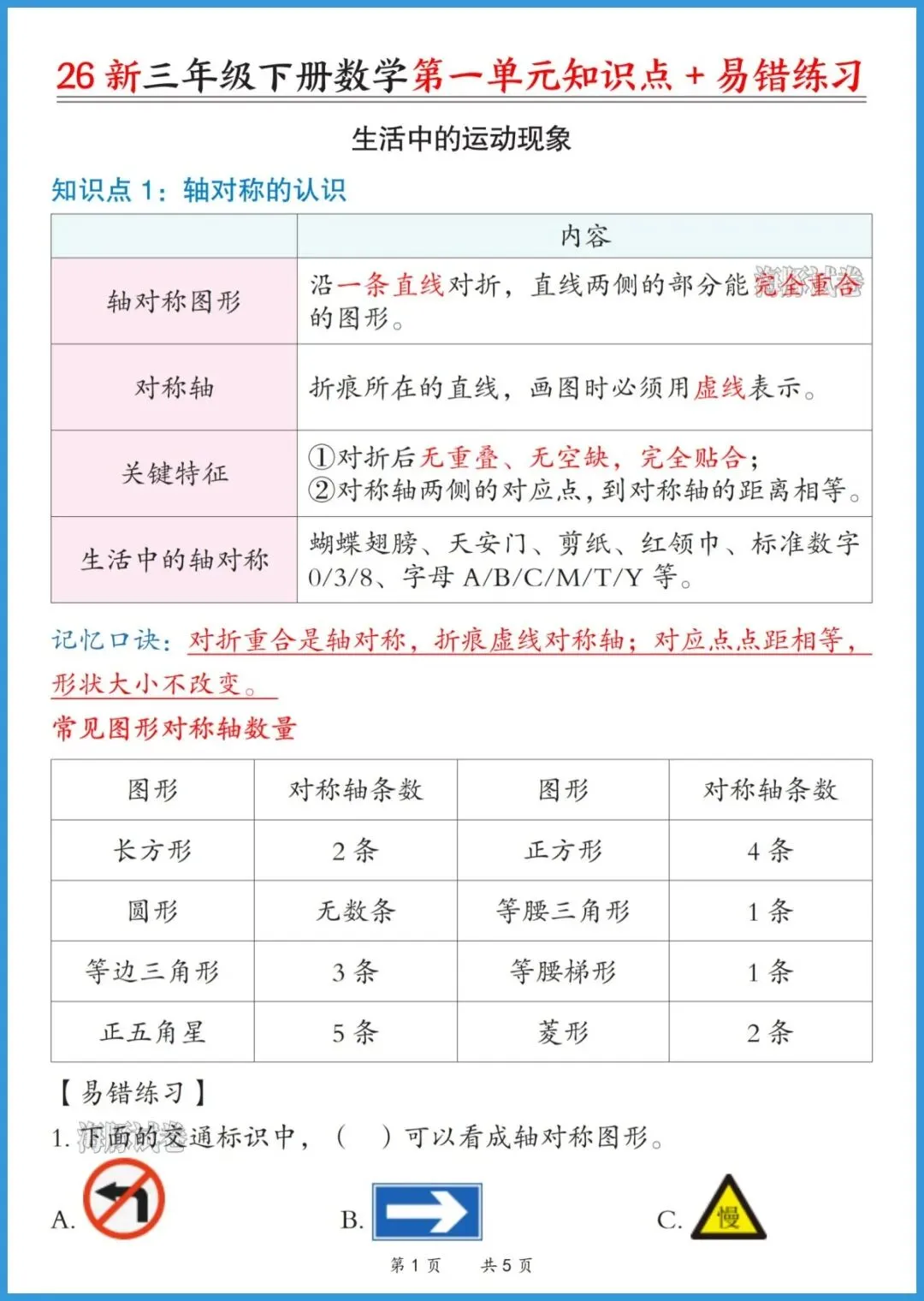 26年春人教版三年级下册数学全册知识点易错练习,45页电子版,一张A4打印就能用!这份资料把整本书拆成12个单元知识清单,配30道高频易错题,每题都标“错因秒解口诀”,孩子写完立刻自查,避免再掉进同一坑。周末每天练3页,期末基础不丢分,压轴题也有思路!想让孩子稳拿班级前三的爸妈,现在就把文件存U盘,今晚打印,明早就能练!