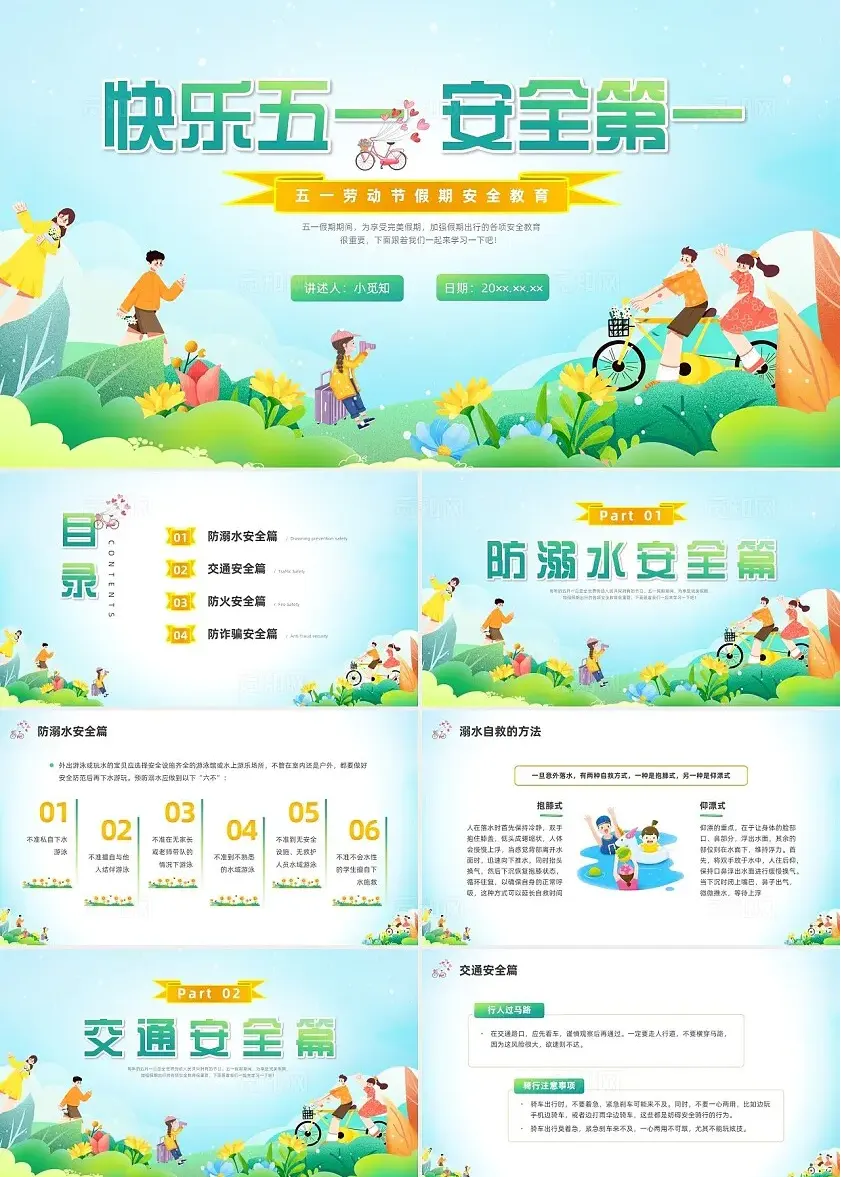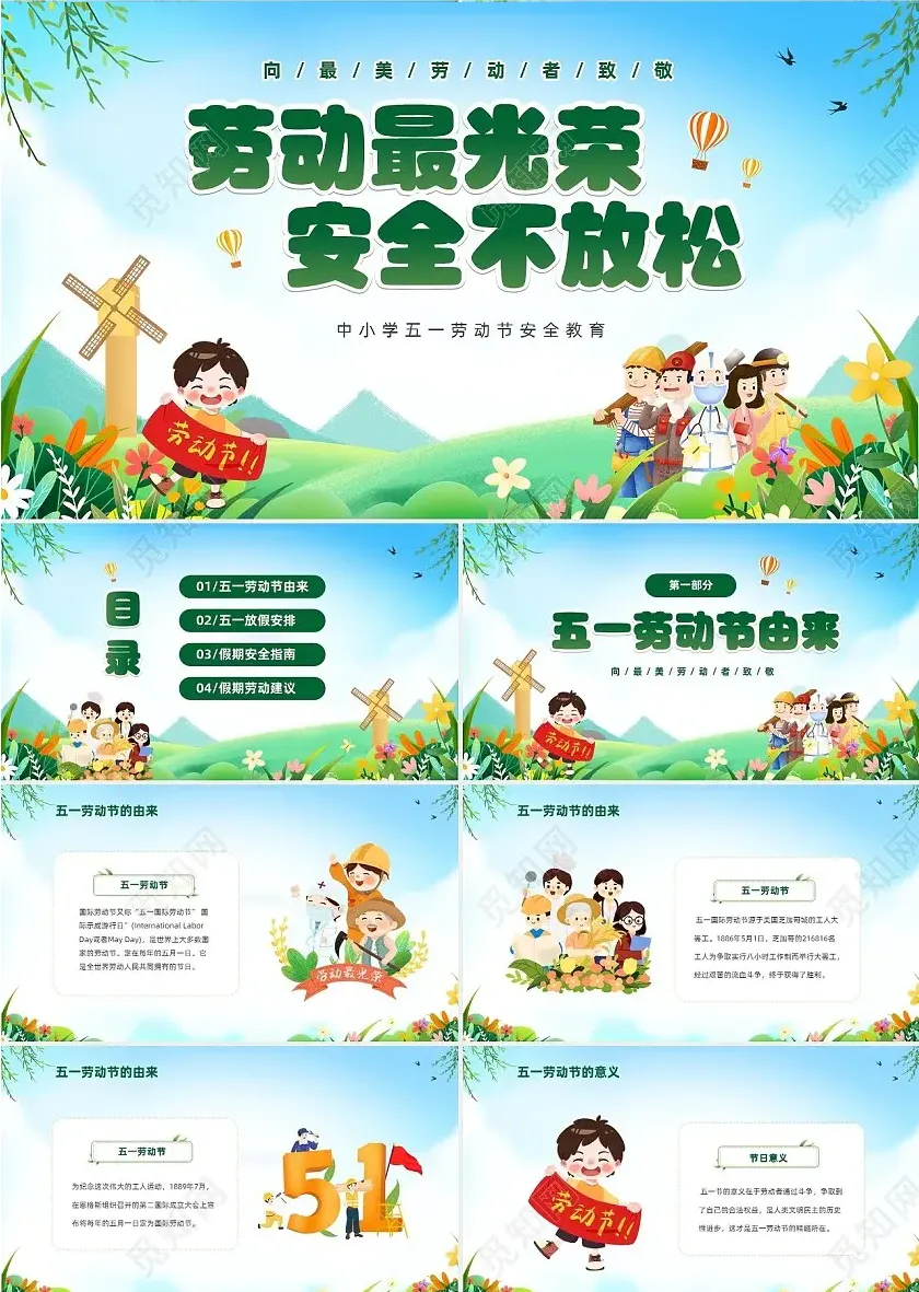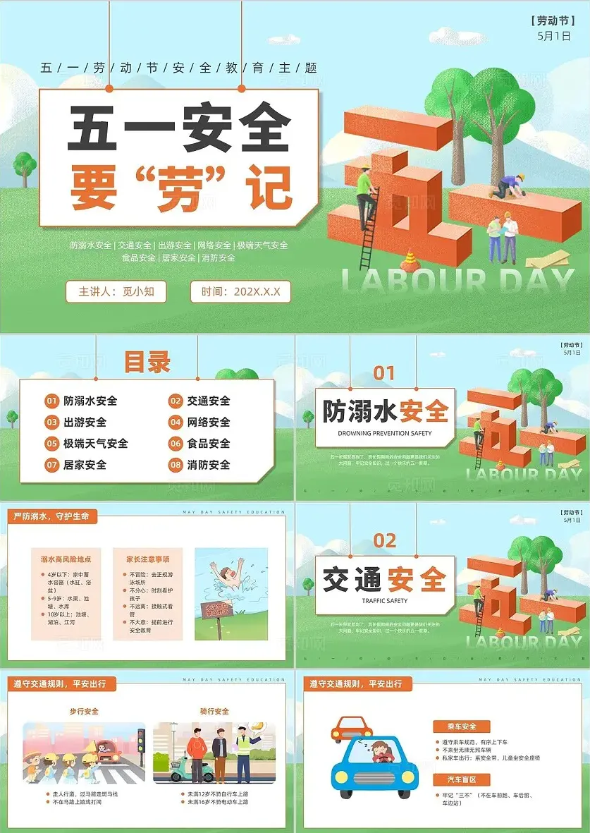 绿色清新插画五一劳动节安全教育宣传主题班会PPT模版
