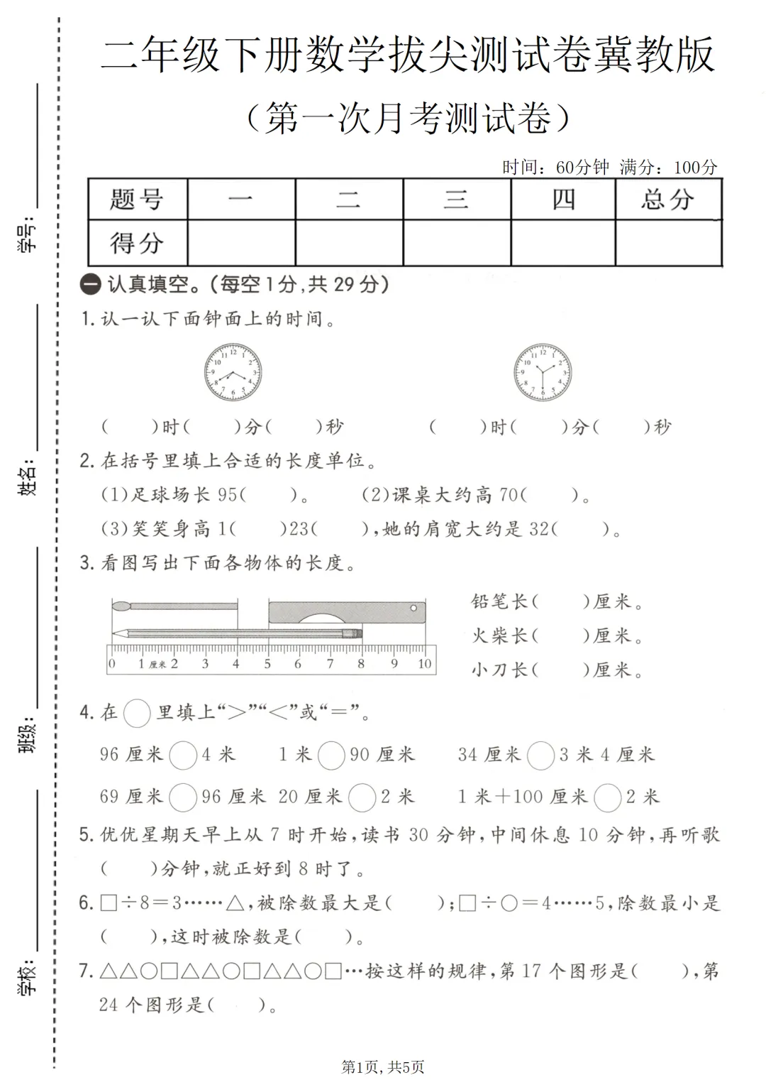 二年级(下)数学 第一次月考拔尖测试卷《冀教版》