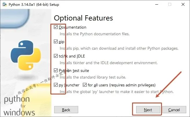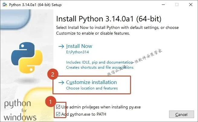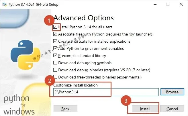 6.①勾选【Install Python 3.14 for all users】;②修改路径地址中的首字符“C”可以更改软件安装位置(例如将C改为E软件将装到E盘);③点击【Install】。