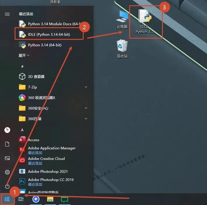 9.WIN10和Win11系统不自动创建桌面图标,返回电脑桌面,点击左下角“开始”按钮在弹出的右侧列表中找到IDLE (Python 3.14 64-bit)快捷方式,鼠标左键按住不放直接拖拽至电脑桌面生成桌面图标,方便以后打开软件
