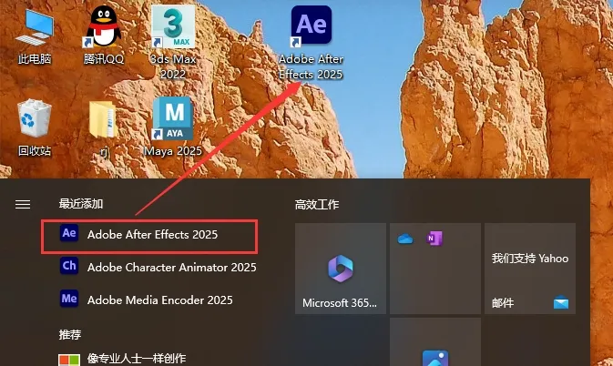 6.在计算机的开始菜单中找到“Adobe After Effects 2025”,将其拖动到桌面以创建快捷方式。