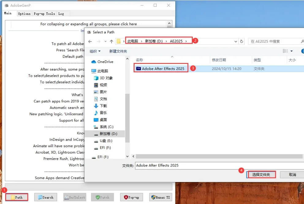 11.开始激活时,点击“Path”按钮,会弹出一个对话框。请找到您在步骤五中更改的安装目录下的“Adobe After Effects 2025”文件夹并打开。