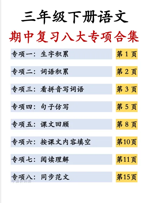 今天给大家分享的是:【免费下载】三年级下册语文期中复习八大专项 SY,PDF电子版,高清电子版可打印。文末有免费下载方式,欢迎保存和下载,如果觉得这份资料有用,欢迎分享到班级群/年级群,让其他家长或老师取用,助力孩子学习,取得好成绩!资料领取方法:【复制下方红色链接】到【微信对话框】发给自己,点链接即可保存,链接易失效,建议小伙伴及时保存到自己网盘,✅手机端先保存后下载送1t空间