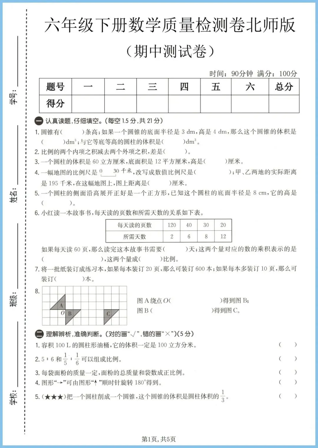 【免费下载】六年级(下)数学_期中质量检测卷1《北师版》 | PDF完整高清电子版可打印