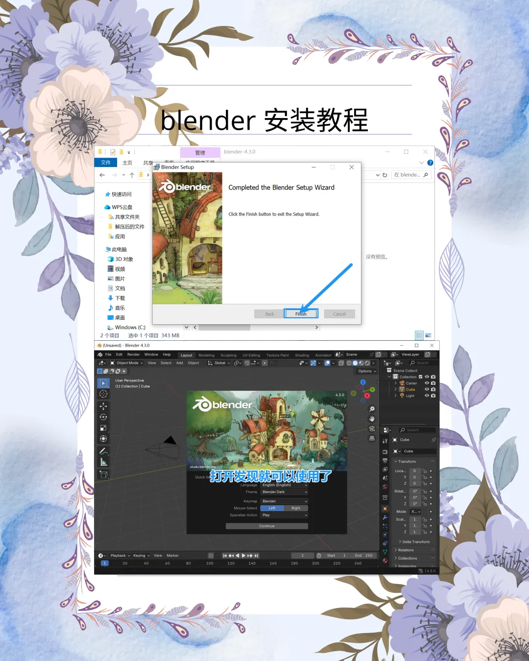 6. 安装完成:进度走完后点击Finish,桌面自动生成 Blender 快捷图标。