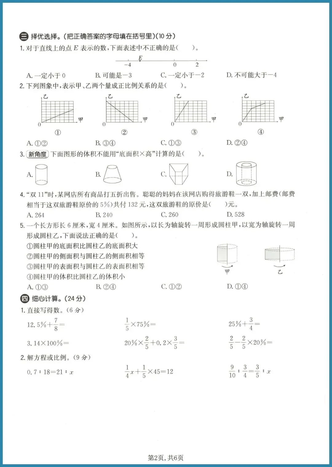 23年春人教版六年级下册数学期中拔尖测试卷,共6页电子版可打印。这套拔高卷专为冲刺高分娃设计,涵盖分数百分数、圆柱圆锥、比例应用等期中重难点,题型新颖、梯度分明,附详细答案与思路点拨,让孩子提前适应压轴题节奏,查漏补缺、拓宽思维,期中稳稳提分!想让孩子数学更上一层楼的家长,赶紧打印练起来!