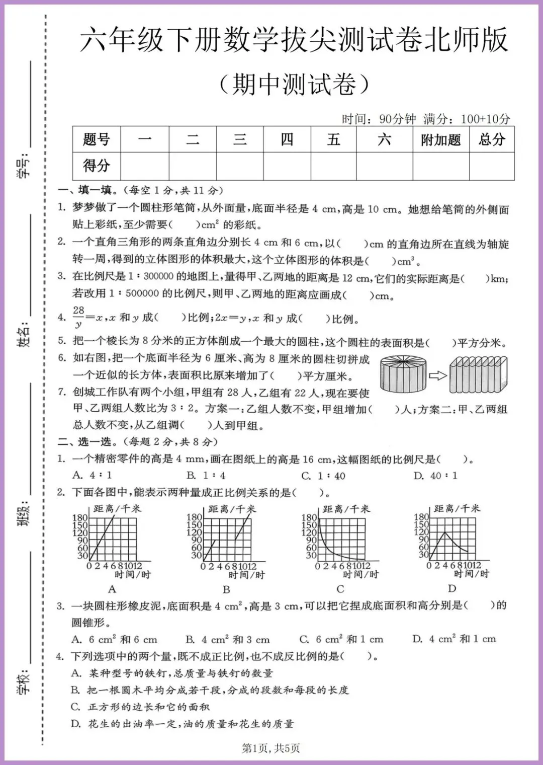 【免费下载】六年级(下)数学_期中拔尖测试卷《北师版》 | PDF完整高清电子版可打印