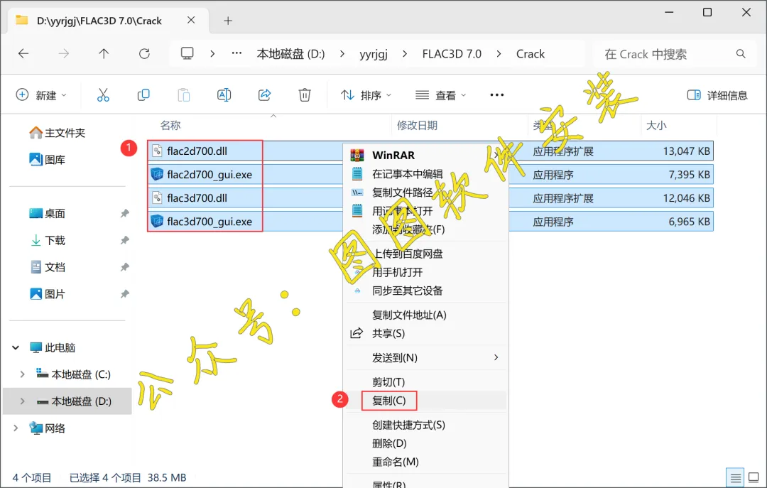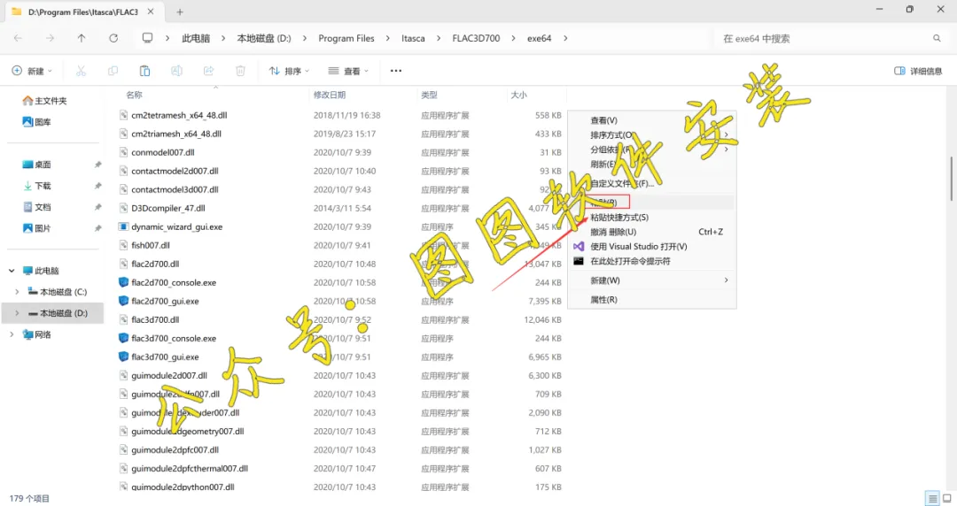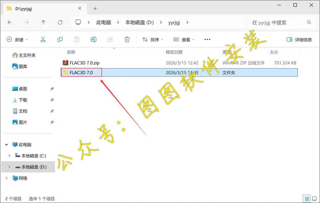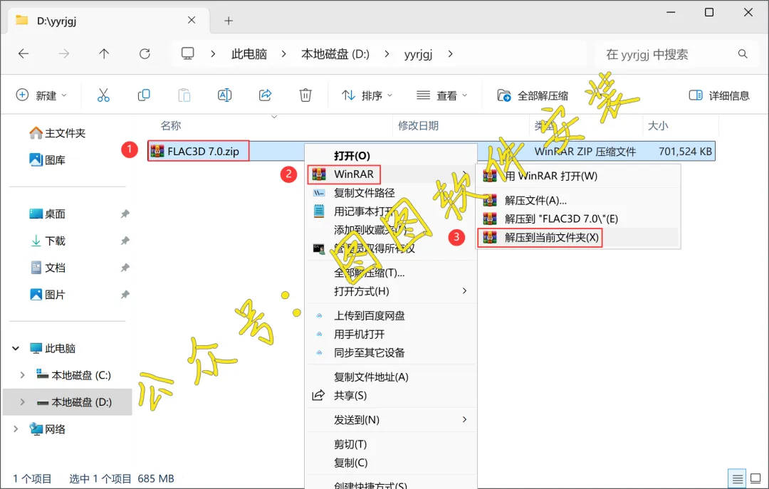 1.将FLAC3D 7.0软件安装包下载到电脑上,我是下载到D盘的一个英文文件夹内。右键FLAC3D 7.0软件安装包,点击【解压到当前文件夹】