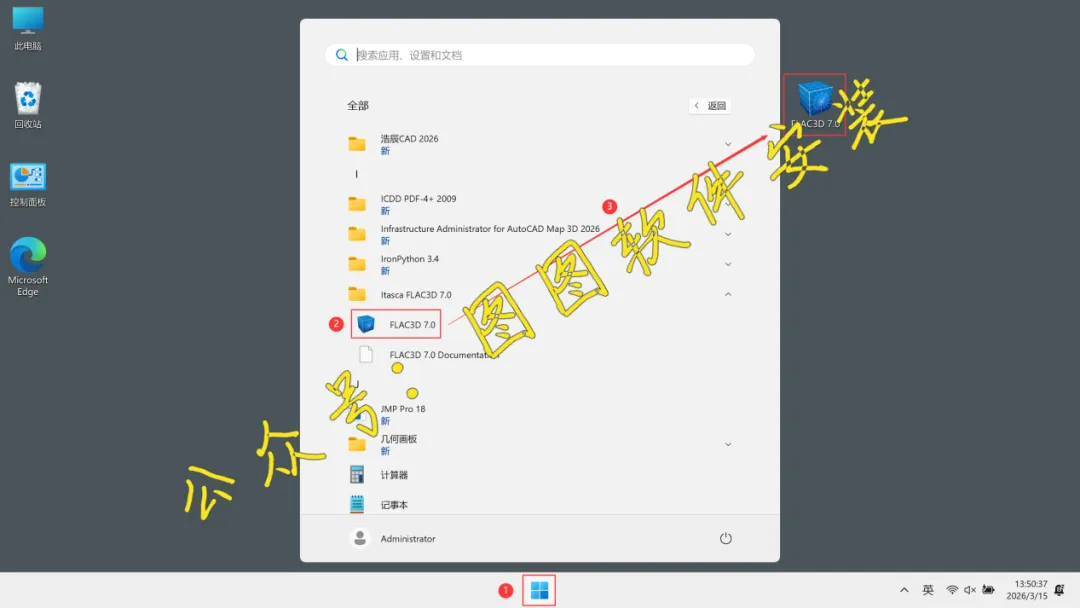 13.回到电脑桌面上,点击【Windows徽标】,找到【FLAC3D 7.0图标】,并长按鼠标左键将软件图标放置到桌面,完成FLAC3D 7.0软件快捷方式的创建