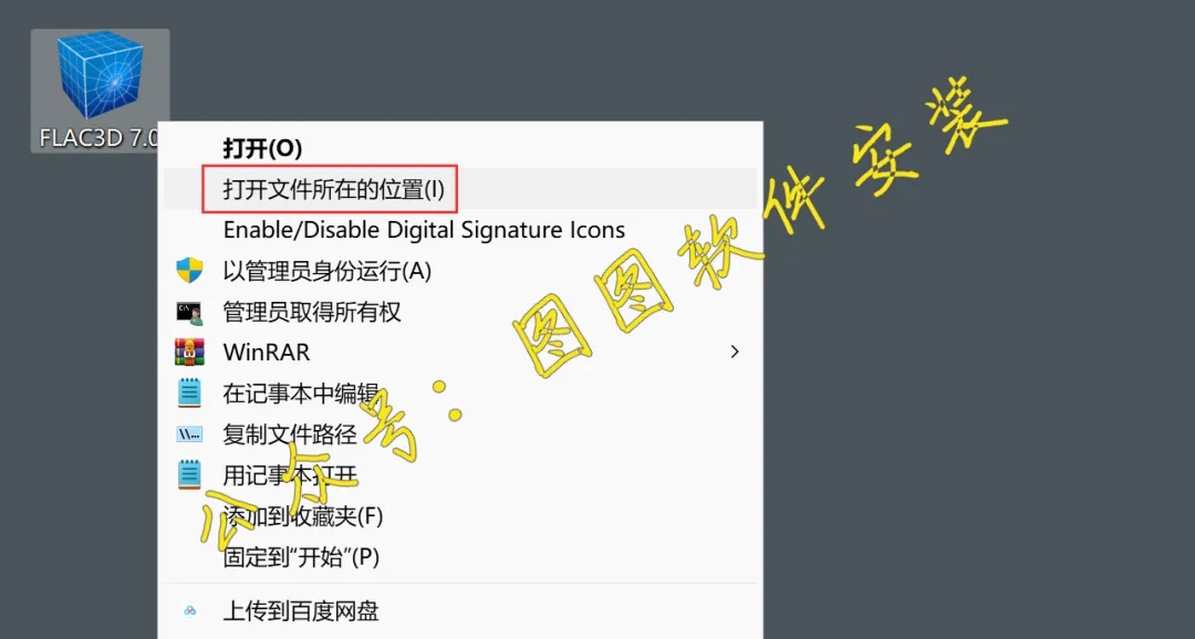 14.回到电脑桌面上,右键【FLAC3D 7.0软件快捷方式】,点击【打开文件所在位置】