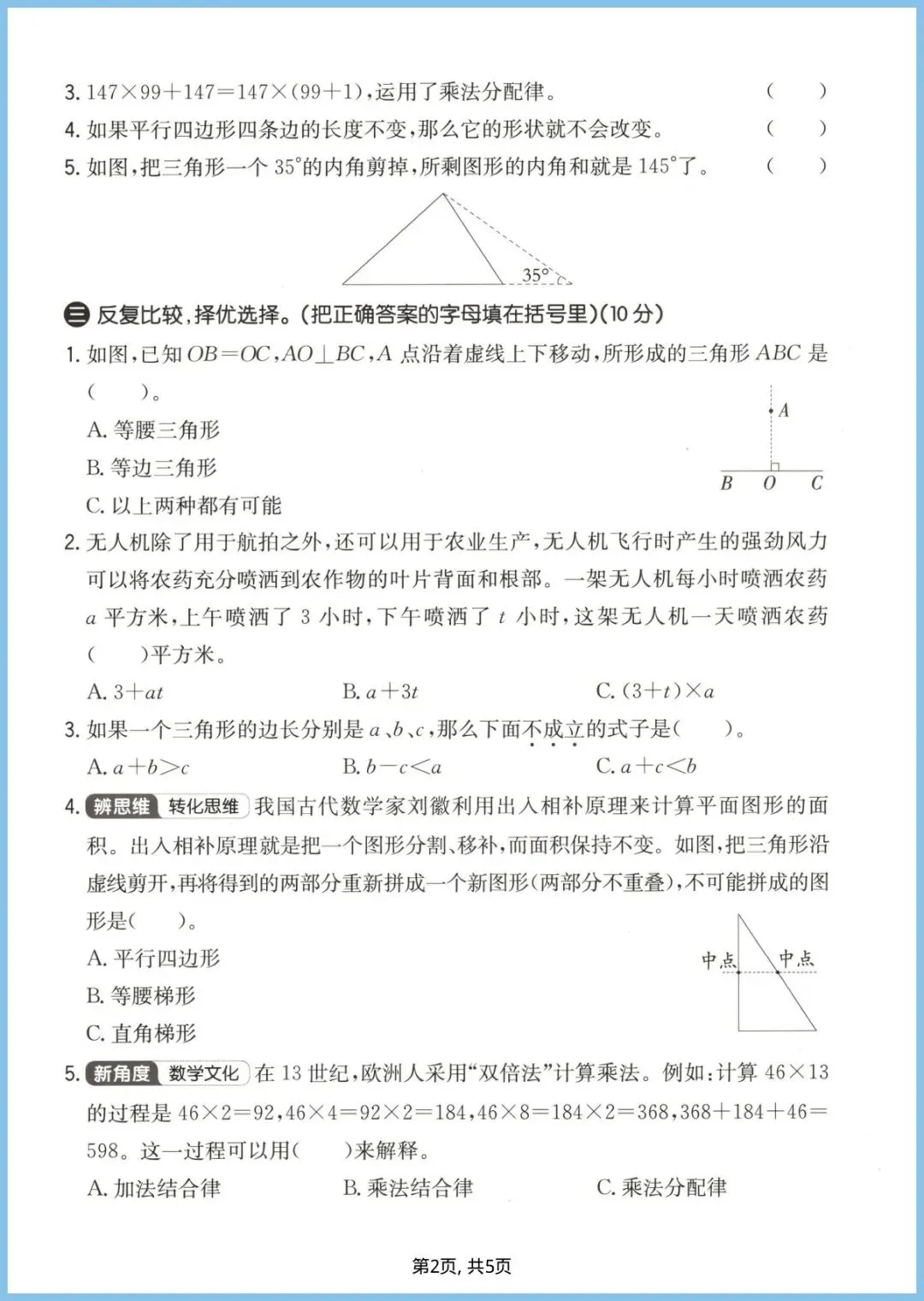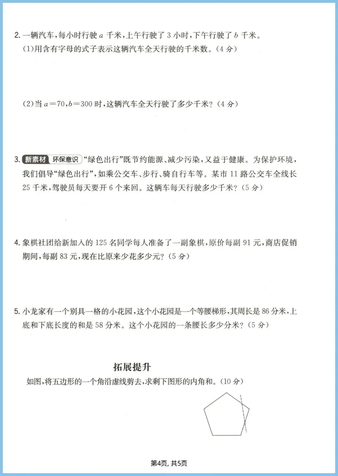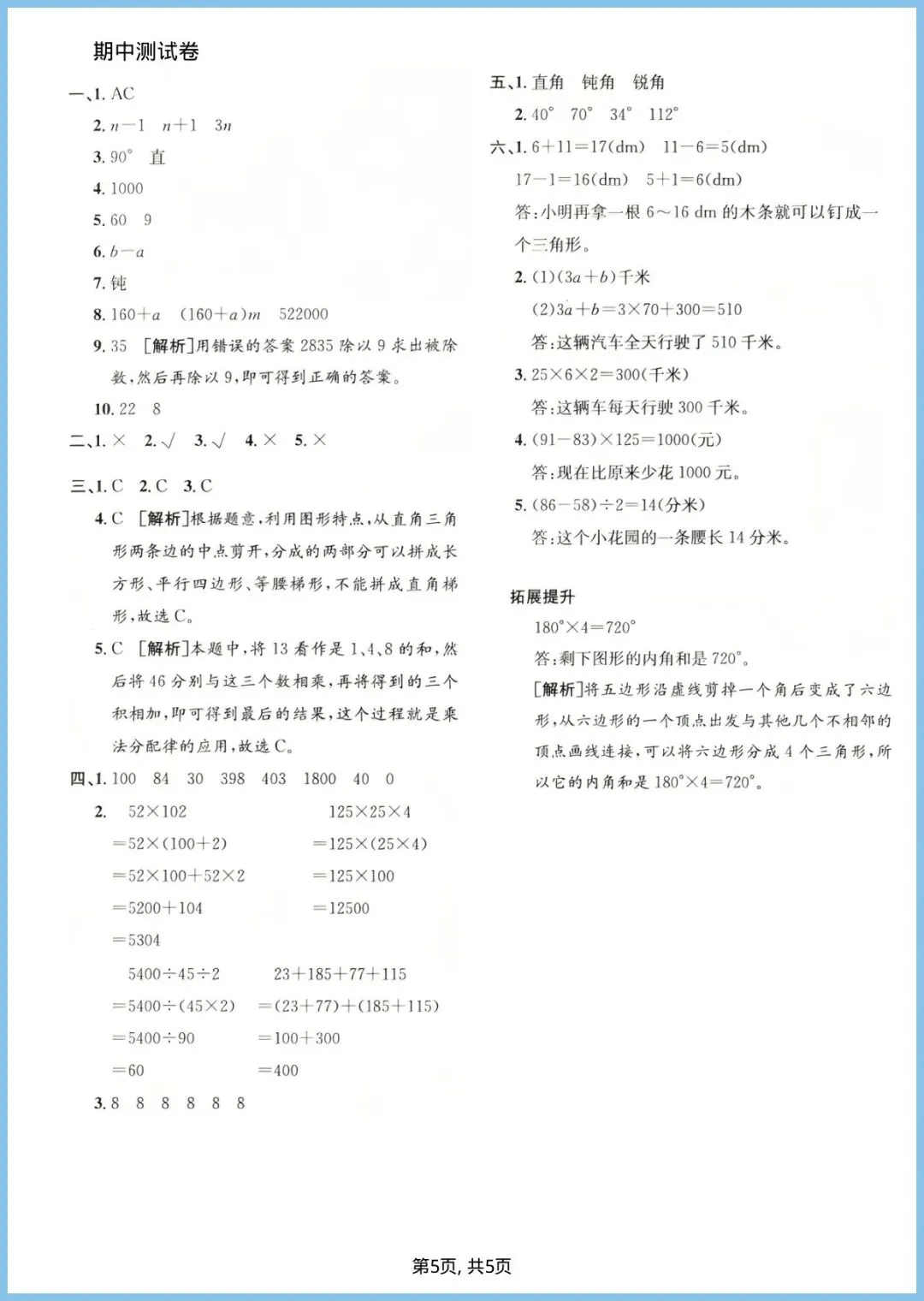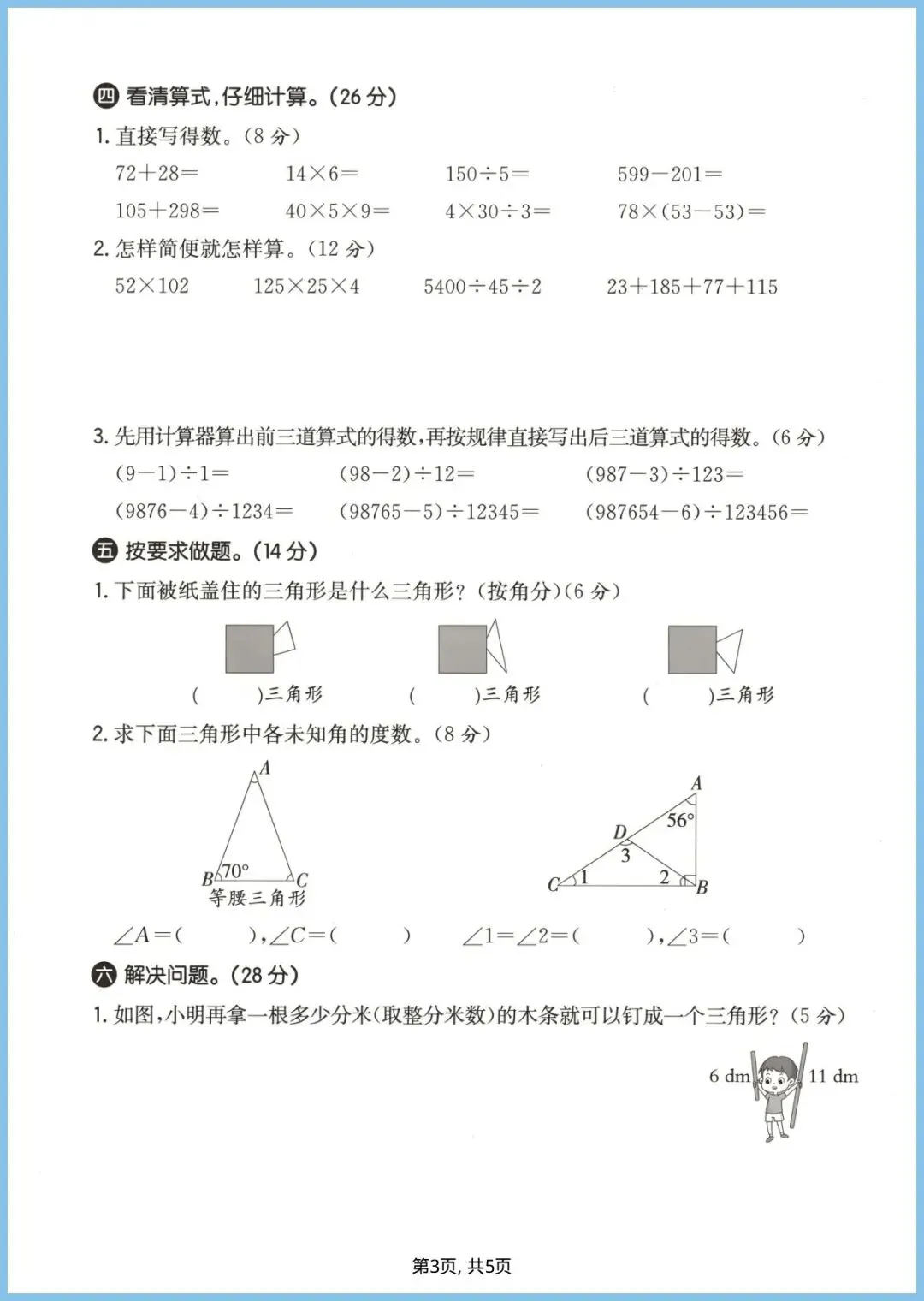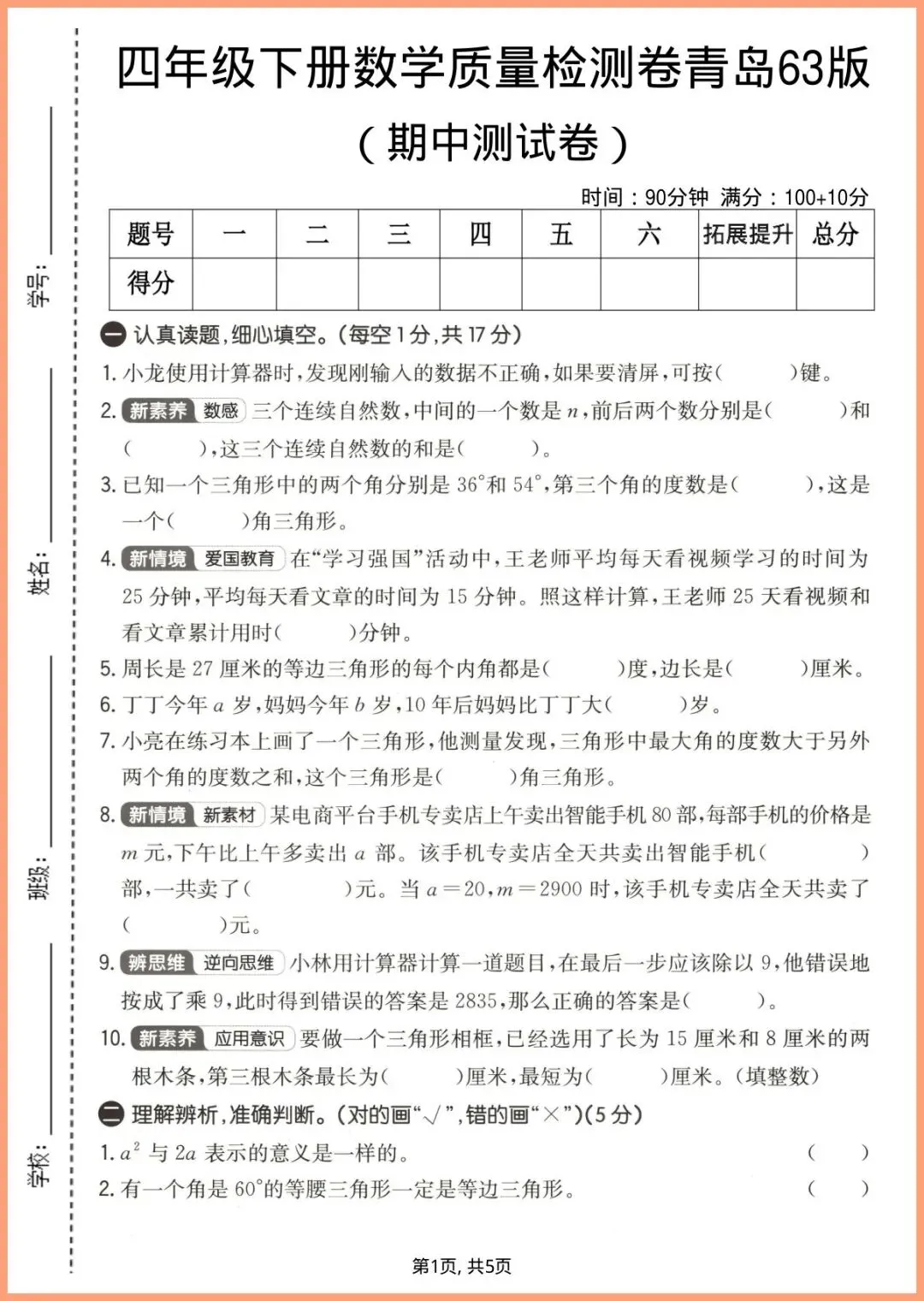 2025春青岛63版四年级下册数学期中质量检测卷,新鲜出炉5页电子版,一键即可打印。这份小卷紧贴课本,把“大数的认识、运算律、图形与几何”三大块揉进典型题、易错题、拓展题,分层递进:基础篇帮孩子稳拿必得分,提升篇训练思维灵活度,压轴题提前试水期中重难点。每题配详细思路点拨,做完自批自改,错题一目了然,后续复习直奔漏洞,效率翻倍。期中想冲高分,现在就差这一练!需要的家长赶快打印,让孩子今晚就动笔吧!