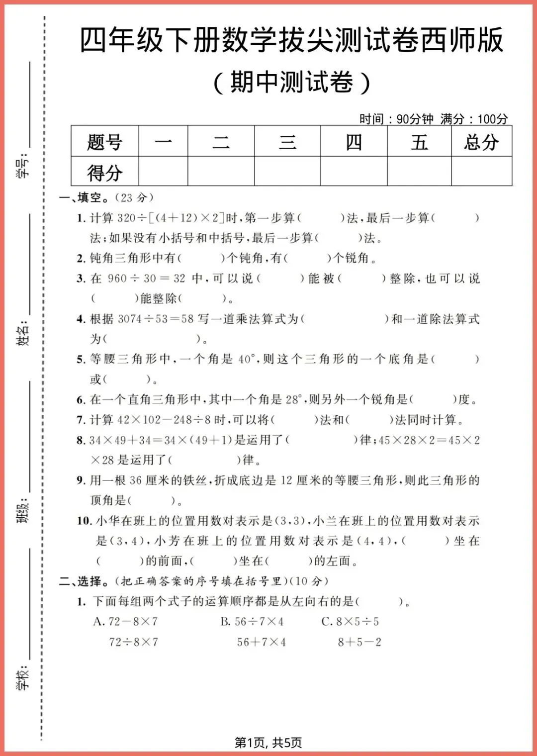 2026春西师版四年级下册数学《期中拔尖测试卷》新鲜出炉!5页精编,专为冲刺期中高分的孩子量身打造。题组涵盖计算、应用、思维拓展三大模块,梯度清晰:基础练速度,拔高练思维,压轴练综合,每题配详细答案与思路点拨,让孩子做完就能自查自纠,把漏洞当场补上。考前刷一遍,信心翻一番!想让孩子期中稳拿“优”的家长,赶紧打印出来,今晚就练!