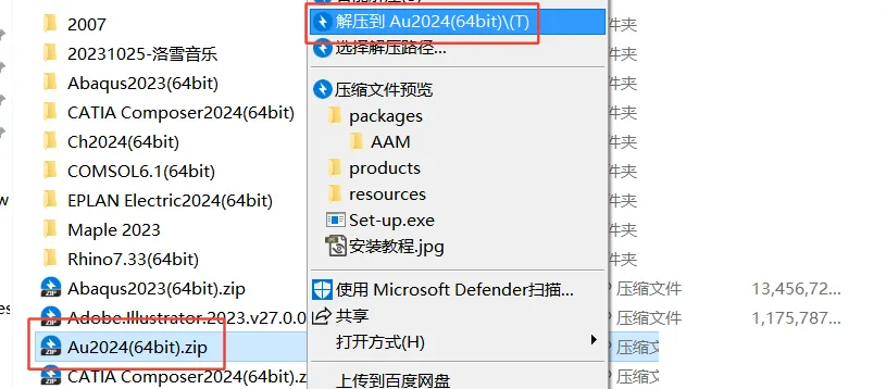 1.鼠标右击【Au2024(64bit)】压缩包(win11及以上系统需先点击“显示更多选项”)【解压到 Au2024(64bit)】
